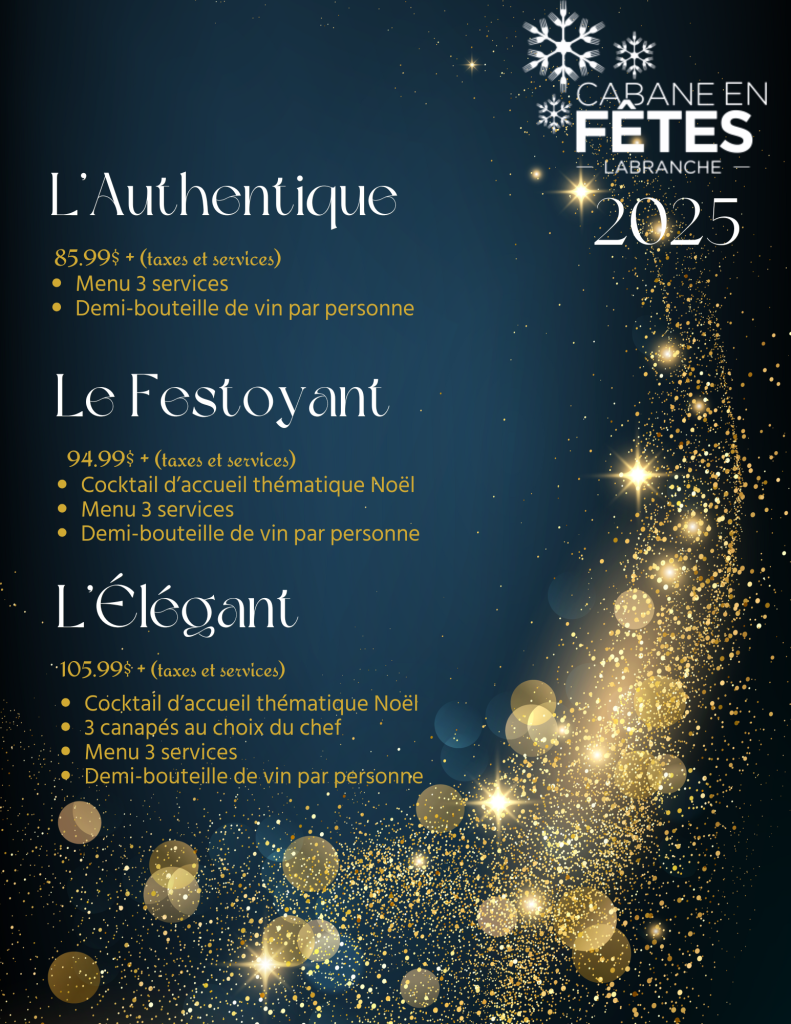Nos forfaits sont disponibles pour des groupes de minimum 40 personnes et peuvent être réservés de la mi-novembre jusqu’en février (Le Domaine sera fermé les 24, 25 et 31 décembre ainsi que les 1er et 2 janvier). Un dépôt non remboursable de 30 % est requis pour finaliser la réservation.